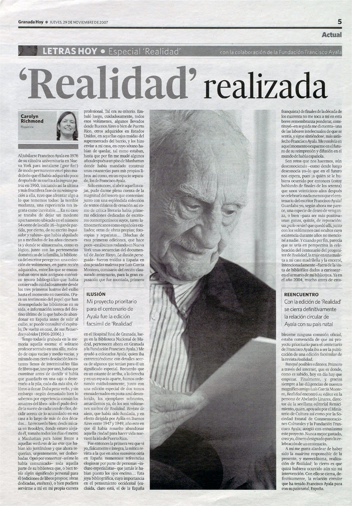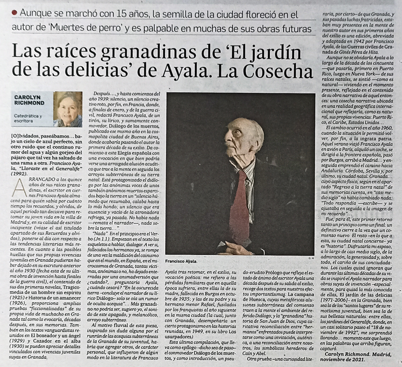 La autora reflexiona sobre la consideración de Ayala como autor granadino, a la vista de lo numerosas y complejas que resultan en su obra las huellas de su infancia y su ciudad natal.